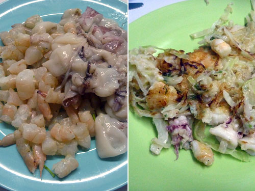 昼間に市場で海老300g(30ペソ=210円)とイカ200g(10ペソ=70円)を買ってきて、夜は海老とイカたっぷりのシーフードお好み焼きだ。海老はメキシコ湾で養殖していて大・中・小と各サイズ別で豊富に売られていて値段は1kg700円からだった。あまりしつこくない味でおいしい。宿で旨い匂いを撒き散らしていたら、翌日、ベルギー人が海老を山盛り買ってきてトマトソース煮を作っていた。魚介アンテナが高い人とは仲良くなれそう。