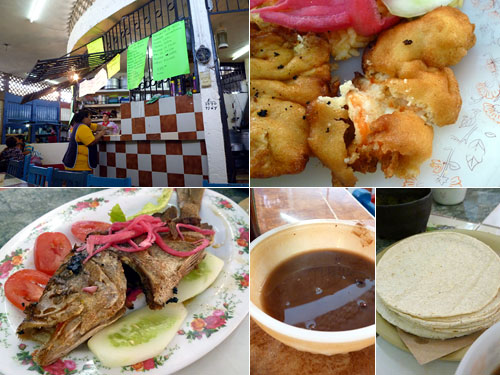 カンクンと違ってカンペチェの市場には新鮮なエビ、イカ、魚がどっさり入っていて魅力的だった。市場内にある食堂では一人45ペソ(315円)で定食があって、魚の丸揚げとエビのエンパニザート(フリッターですね)の2種を注文。魚に比べると海老はボリュームが少なくて高価なんだなぁ。ちょっと干して旨みが出ている魚の方がお得感がある。付け合わせには茹で小豆(甘くない)とトルティーヤ。これでかなりお腹いっぱいになる。
