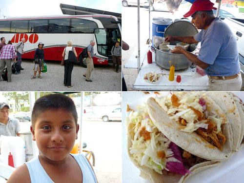 夕方カンペチェからパレンケに到着。午後6時近くということもあり、宿に行く前にバスターミナル近くの屋台で軽く夕食を摂ってしまうことにした。ここのタコスには塩でしんなりさせたキャベツの千切りが入っていてそれだけなのに非常に旨い。温かい感じのおやじさんと、しっかりして澄んだ目の少年もタコスに味わいを加えていて、通りすがりの屋台ながら印象深い「いい味」の店だった。タコスは1個5ペソ=35円。具もたっぷりして相応の値段だ。