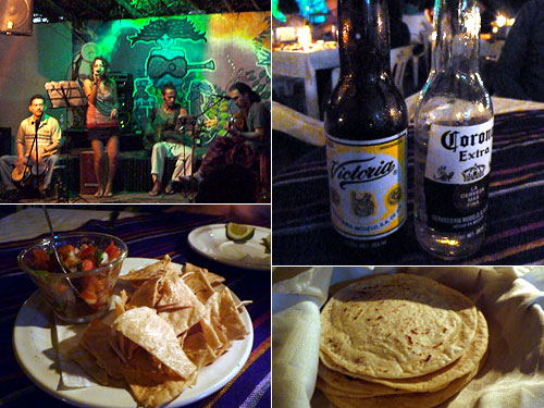 人里離れた森の中に4軒の宿があるエル・パンチャンという場所に宿泊している。昨日の夜は到着してすぐだったのでバスターミナルで屋台タコスを食べてしまったが、ここに来てみていい感じのレストランがあることがわかって、今日はレストランで夕食だ。午後8時になるとすてーじで日替わりの生ライブが始まる。今日はボサノバ。ビールを注文するとトルティーヤチップスとサルサが来てご機嫌に食事が待てる。