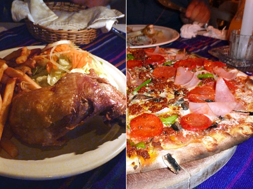 チキングリルにポンフリとサラダのついたセットメニューと30cmはあろうかというピザは共に各85ペソ=\595。普段の食事からしたら贅沢だが、森のリゾート内レストランで生バンドを聞きながらの夕食と思えば安いではないか。特にピザはメキシコには珍しくパンピザではなくうす焼きの生地でチーズはオアハカチーズだろうかよく伸びて焦げ目が香ばしくておいしい。10%サービス税混みで242ペソ=\1694だった。