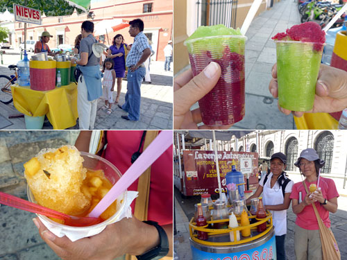 「3月に入ったら日中のオアハカは暑いですよぉ」という知人の予言通り、今日の暑さは尋常ではない。歩いていてクラクラする頃には路上でカキ氷屋台が都合よくでているってなわけで、立て続けに2つのかき氷を食べることになった。メキシコではカキ氷はニエヴェ。スペイン語で雪の意味で雪のないメキシコでロマンチックなネーミングだ。路上のニエヴェは1つ10や15ペソ(70〜105円)で毒々し色のシロップが選べるが味にあまり違いがない。