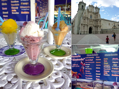 オアハカ在住のシムラさんから教えてもらったニエヴェの人気スポットはラソレダー教会の隣の広場。ここには5軒くらいのニエヴェ屋さんがあるのだが、どこも外れがない人気の味だそうだ。2種類セレクトで25ペソと街中屋台より高いが一つ一つに素材の味がしっかりしていて全然レベルが違う。種類は果物系とお酒系があってテキーラやオアハカ地酒のメスカルやブランデーなんてのもあり、大人にニエヴェを楽しめるのも面白い。