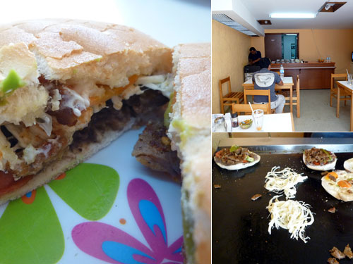 タコスと並ぶメキシコの庶民的スナックにトルタスがある。メキシコ版ホットサンドなのだが夫がパン類が好きではないのでこれまで食べたことがなかった。遅い昼で他に選択肢がなくてようやくトルタスを食べるチャンスに恵まれたというわけだ。店の奥の鉄板でパン、刻んだ肉、チーズが温められキュウリやトマトやマヨネーズやアボガド辛いピクルスがはさみこまれて出来上がり。カリッとしたパンとメキシコらしい具でなかなか旨い!20ペソ。