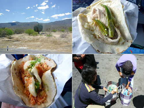 オアハカからメキシコ・シティーに移動する日。車窓からは巨大サボテンがにょきにょき生える丘が見えて何ともメキシコ的な風景が楽しめた。昼時「はい、5分停車」とバスが止まったドライブインで一斉に乗客は降り、昼飯調達。私はバスを降りてすぐの所で売っているタコスにした。トマトライスと茹で卵、豚肉とピーマン炒めというシンプルながらおいしい組み合わせのタコスで大満足。地方によって少しずつ内容が異なるからタコスは面白い。