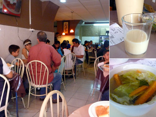 モーレ・ポブラノというチョコレートを使ったソースの発祥地でグルメの街としても有名なプエブラだが、前回は市場前に並ぶツーリスティックな店で失敗。今回こそはと街を歩き回りソカロの西角にメキシコ人が行列を作る店を発見。3 Ponienteと16 de Septiembreの角にあたる。定食45ペソ(315円)で前菜4種、炭水化物2種、メイン12種から選べる。夕刻なのにランチを出すのも珍しい。着席するとまずジュースが出た。