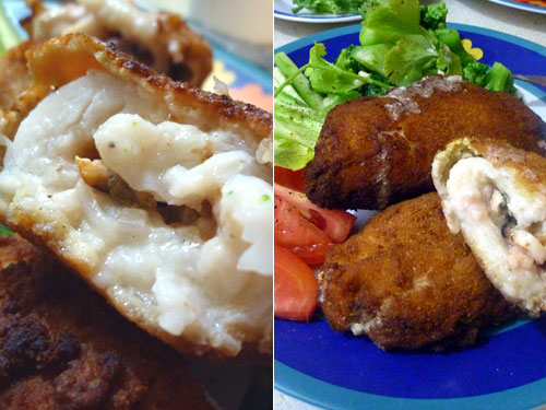 レストランで食べてとてもおいしかった料理を再現。ムール貝とイカと海老の冷凍ミックスをにんにくと玉ねぎで炒めベシャメルに入れる。冷蔵庫で冷やし固め、叩いて伸ばした白身魚のフィレに巻いて、衣をつけて揚げた。こんなに頑張ったのにおいしくない。原因は白身魚に泥臭いナマズを使ったこと、魚が肉厚すぎること、詰めものがトマトソースの方が良かったことだろう。手間がかかったのに今一つでがっくり。
