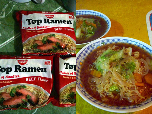 プエルト・プラタの大型スーパーSirenaには日本と韓国のラーメンが数種類置いてあるがNISSINのTop Ramenというのを初めて見たので買ってみた。1袋85g。ビーフ味はつまり醤油味ってことでさすがNissin、スープの味は悪くないが麺が今一つ雑なざらざらした感じでNissinっぽくない。他に日本からのエントリーはメキシコでもメジャーなMaruchan。Maruchanのスープは化学調味料がギヤっと舌を刺激しておいしくないのでNissinの勝ち。
