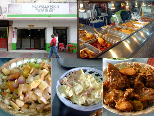 サント・ドミンゴ旧市街の中心通りエル・コンデ。めざすシーフードレストランがとても高値だったのでがっかり。ところがペキンと書かれた中華食堂に入ったら今日のランチのメインの1つがセビッチェだった。レストランで小さな皿に単品のセビッチェが250ペソなのに、こちらはサラダとご飯がついて100ペソ(250円くらい)だから大分お得だ。他のメインの肉料理は牛肉のトマト煮込みで地元料理。ここでは地元料理6割くらいで出している。