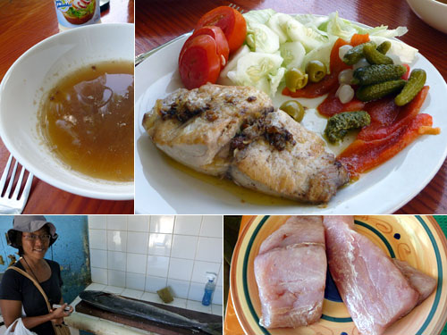 スーパー・リンドで食料品を買ったあとに魚屋をのぞくとさっき見に行った時にはなかった巨大魚が入荷していた。ドラダは日本ではシーラと呼ばれてあまりおいしくなくて市場に出ないらしいが、買った魚の切り身は薄いピンクでソテーにすると真っ白になりマグロ系の身の崩れ方でマグロよりは柔らかく癖もなくておいしかった。インスタントの仏製オニオンス―プを前菜に、トマトときゅうりとピクルスを添えて。