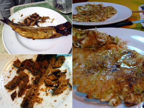 どこのスーパーでも売っている魚の燻製。スーパーで他のお客に聞いたらそのままおつまみとして食べるのだそうだ。気になるこの魚を買ってみた。スモーキーな風味でかなりしょっぱいので身をほぐしてお好み焼きに入れてみると案外おいしかった。中には卵が入っている魚もあって、からすみのような味わいもあり、これは酒のあてになるおつまみだ。スモークで生臭さがとれ、皮と身の間にかなりの脂っこい味わいもあってあとを引く。