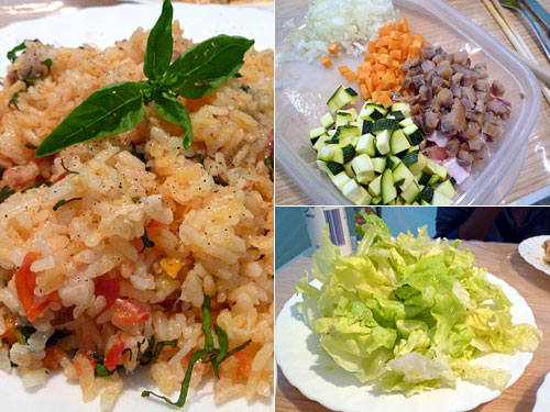 メインは、燻製魚、ズッキーニ、玉ねぎ、人参、トマトを炊き込んだご飯にした。これにレタスオンリーのサラダ。炊き込みご飯は最初ににんにくと玉ねぎを炒め、そこに材料を入れて、最後に米も入れて炒めて水を入れて炊く。燻製魚から適度な旨みと塩分が出てトマトが臭みを消してくれてブイヨンなしでも十分においしかった。もちろん白ワインに合う。トマトがもっと多くても良かったなぁという次回への反省。