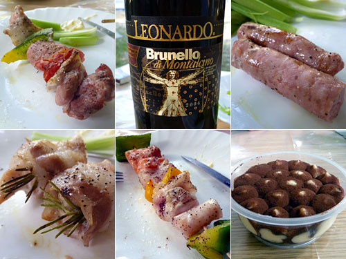 長い間持ち続けてきたブルネッロ・ディ・モンタルチーノもこの暑さで将来の命が危ぶまれる。ということを理由にBBQで飲んじゃえってことになった。今日はセットとシーフードの串物。セットには豚肉とピーマンの串、サルチッチャ、鶏胸肉のベーコン巻ローズマリー風味。ベーコン巻が洒落ていて美味。シーフードは魚数種で鮭が特にグッド。ブルネッロのレオナルドはバーゲン品だったが特に問題なく香り高い。