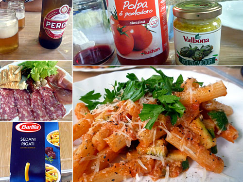 献立:ビール、前菜、トマトとアーティチョークペーストのパスタ、赤ワイン