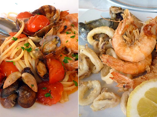 パスタはリングイネで、熱いオリーブオイルでミニトマトを強烈に炒めてベースにしていた。トマトを軟化させるためかかなりの量のオリーブオイルを使っていた。具はあさり、エビ、イカが散りばめられそこそこ魚介の味もするが自分達の1kgあさりパスタと比べるとだしが薄い。フライは良かった。天ぷらに近い。こんなにカラッと薄い衣で仕上げるのは自分では難しい。水2つ注文して合計36ユーロ。