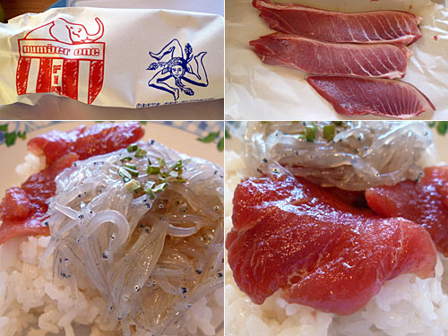 観光を切り上げてキャンプ場に正午くらいに戻った。頭に3本の足の生えたシチリアのシンボルがプリントされた包みを開けてマグロとご対面。一口大に切って醤油をかけてしばし置く。ご飯が炊けたら白魚にレモンをかけて、熱々ご飯にマグロと白魚を乗せてはふはふとかきこんだ。ぷつぷつと口の中ではじけてとろける食感と上品で淡い甘味とほろ苦さのある白魚はイタリアに来てからずーーーっと夢見ていた味。ああ、至福のランチ。