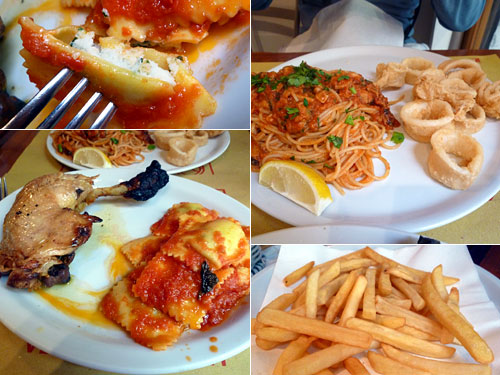 私はホームメイドラビオリに惹かれてチキンセット。カッテージチーズのラビオリは作りたての柔らかさでホームメイドに偽りなしの旨さだった。これに皿一杯のポンフリが付く。夫のイカフライはアマトリチャーナ風パスタ付き。パスタも120gはあるんじゃないだろうか。イカはカラッと素敵にあがり問題なく旨い。ドイツ人の集まる店で値段がそこそこの場所っていいなぁ。ドイツ語ガイドを買うべきか?