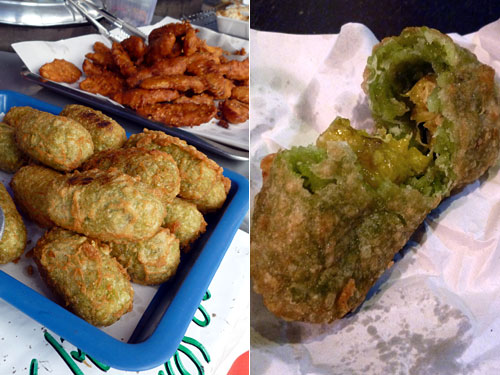 辛いランチの後に少しだけ甘いものが食べたくなる。同じくチャウエンフードセンターの屋台には揚げたバナナやたこ焼き型にココナッツミルクの生地を入れて焼いたスィーツがあり、これはバンコクでも見かけるものだったが、もう一つ見慣れないスィートがあった。何かで緑色に着色されたもち米を軽くつぶして中にバナナを入れて小麦粉をまぶして揚げたおやつ。米の部分は甘くなくバナナの甘さで食べるもので美味だった。1つB10(28円)。