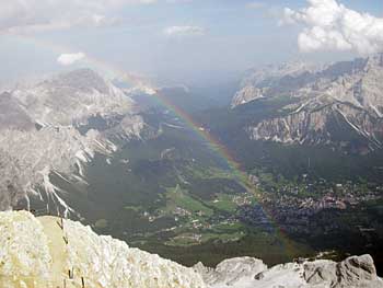 到着した時はやや雲が出始めた程度だった空は、風に乗って雲がどんどんと押し流されて来てあっという間にコルティナの町に霧雨を降らせた。その霧雨に雲間から指す太陽の光が当たって壮大な規模の虹がかかる。最初はうっすらと短くあらわれた虹は次第に濃さと長さを増しながらコルティナを覆い尽くすほどまでに大きくかかっていく。