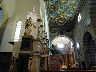 宗教博物館を出て左に回り込むと、すぐにドゥオーモが見える。13世紀の半ばニコラ・ピサーノ作ですって。ニコラ・ピサーノといえば、昨日シエナのドゥオーモ内で立派な説教壇を見てきたばかりだ。ピサ・ロマネスク様式のファサードということで、傾斜した屋根の真ん中が一段高くなっているのは同じピサ・ロマネスク様式のピサのドゥオーモと同じだが、あちらと比べるとだいぶおとなしい感じだった。