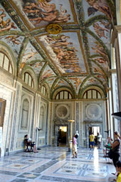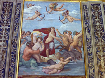 ファルネジーナ荘は昨日訪れたカンポ・デ・フィオーリやファルネーゼ宮のある辺りからテヴェレ川を渡った所にある。もともとはキージ家の所有で1520年に完成。当時はローマ中の芸術家、インテリ、美女の集まる華やかなサロンとして有名だったそうだ。その後16世紀の終わりにファルネーゼ家が買い取り、現在は政府所有になっている。館内は宮殿を見るというより、ここに所蔵されているラファエッロの作品などが観賞できる美術館として機能していた。