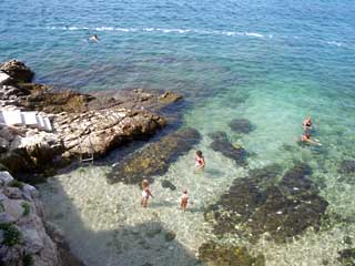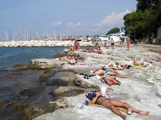 バスターミナルから半島までの200mくらいのメインストリートはパステルカラーの可愛らしい3階4階建のビルが並んでいる。ハーバーにはヨットやクルーザーが所狭しと係留されていた。パステルカラーの家が並んで船が並んでいるのはポレチも同じ状況なのだが、家がよくメンテナンスされてどこも美しくパステルカラーなロヴィニに、やっぱり人気が集まるのは無理もないと思わせる。半島の一番突き出た部分はビーチになっていて、まだ午前中で水も温まっていないというのに早くもやや震えながら海水浴を行っている人がいた。水は透明度が高く美しい色をしている。この点でもポレチよりロヴィニの方がいいな。