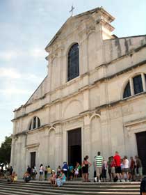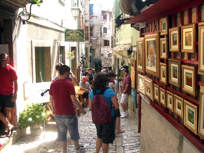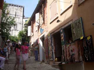 ロヴィニのこの小さな半島は中央が高く盛り上がっていて教会になっている。私達はビーチ側から上がってみたのだが、教会自体はまぁまぁ。面白いのはこの教会の裏手から半島の付け根へと下っていく坂道だった。古い石畳の道沿いにはアートギャラリーやアクセサリー店が並んでちょっとモンマルトルみたいな雰囲気をかもし出しているのだ。