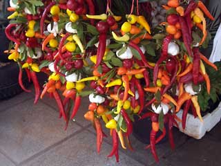 様々な唐辛子を花束のようにまとめた房が見事。今まではこういうのを見た事がなかったので、これの出る季節になったのかもしれない。