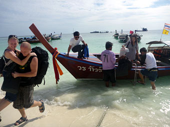 一番長くて賑やかなビーチは三角形の底辺となるパタヤビーチ。砂の肌理が細かくて色も真っ白な砂浜、穏やかに寄せて返す波、適当な影を作ってくれる樹木もある。外から来る船の乗客はここの沖まで来て、岸まではロングボートと呼ばれる木船に乗り換える。一人50バーツのこの予期せぬ船賃は多くの旅行者の怒りを買っているが、ヤクザな木船の船頭は金を手にするまでエンジンのスイッチは入れない主義なので、みんな渋々支払う事になる。