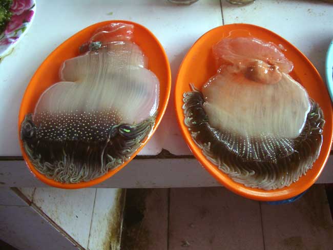 そんな中、目をひいたのはイソギンチャク。貝売り場に出ていたのだが、これって食べるんだよねぇ。モダンアートのような美しい姿に見惚れてしまうがおいしそうかと言われると見た目は食欲がわかない。いやー、食べてみたかったイソギンチャク。センポルナ、まだまだ課題が残っているなぁ。